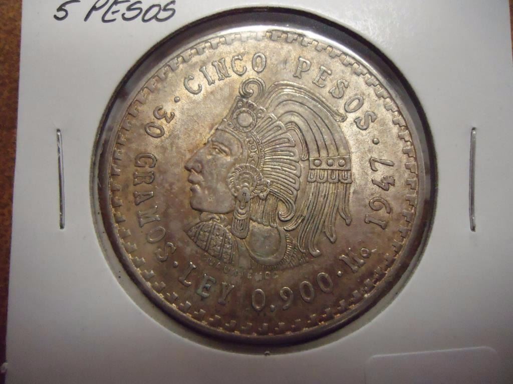 1947 MEXICO SILVER 5 PESOS .8680 OZ. ASW