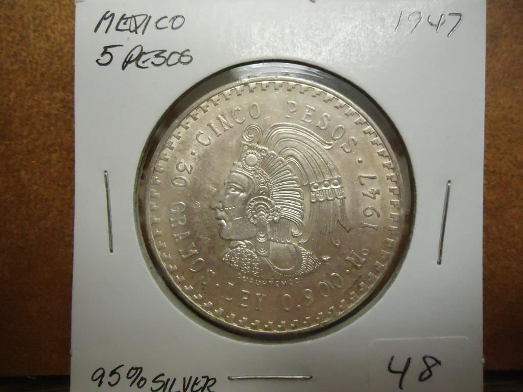 1947 MEXICO SILVER 5 PESOS UNC .8680 OZ. ASW