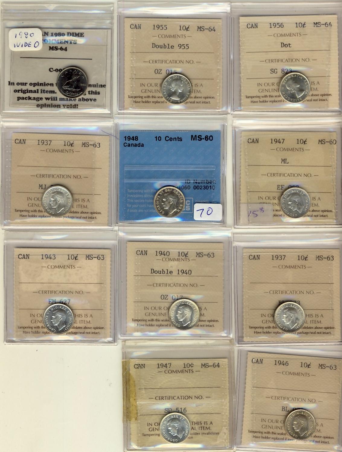 1947 ML 10¢, 1948 MS60, 1937(2), 1940 Dbl Date, 1943, 1946 MS63, 1947 MS64 along with 1955 10¢ Dbl 955 & 1956 Dot ICCS MS64 & 1980 Wide 0 PCGS MS64. . Lot of 11 dimes all certified.