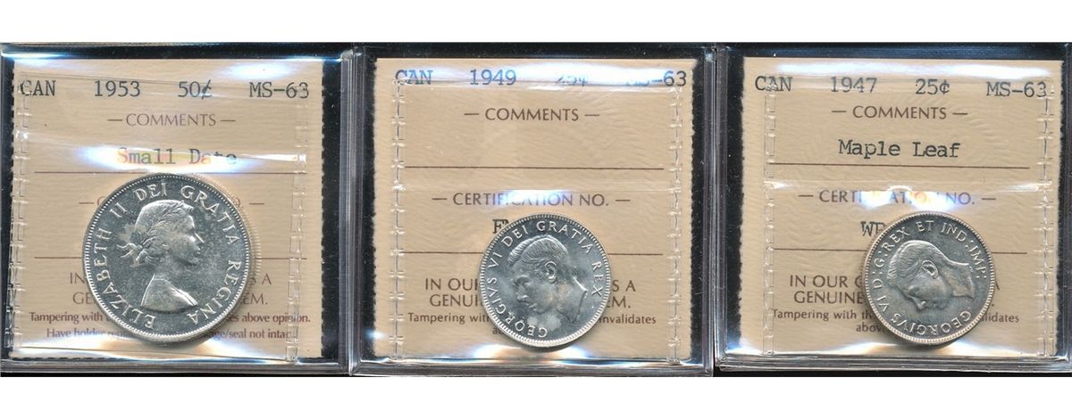 1947 ML 25¢, 1949 & 1953 SD 50¢ ICCS MS63. Lot of 3 white coins.