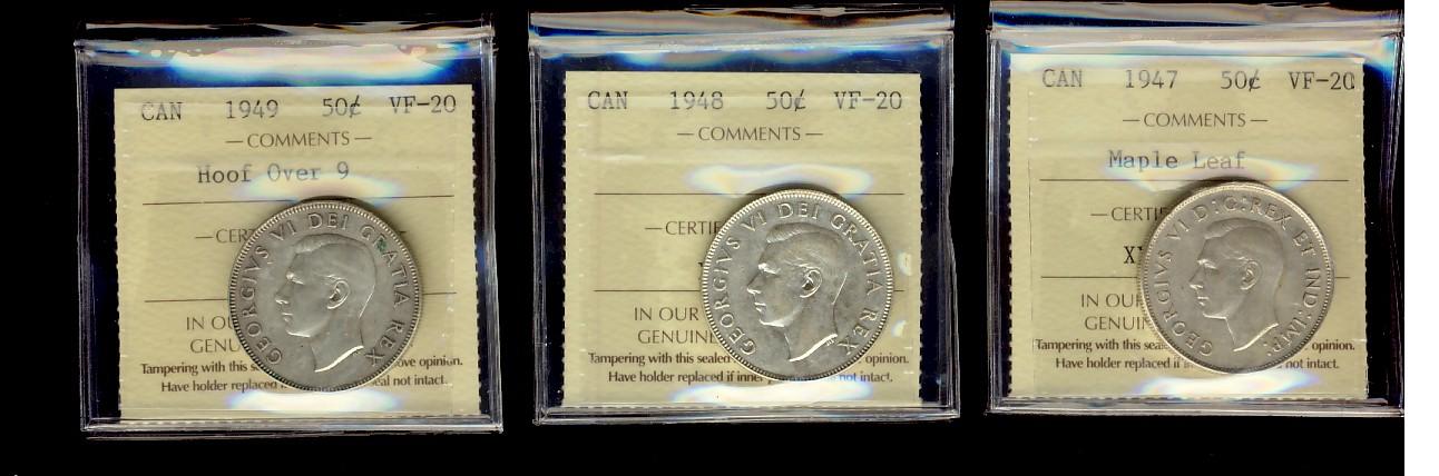 1947 ML 50¢, 1948 & 1949 Hoof ICCS VF20. Lot of 3 coins.