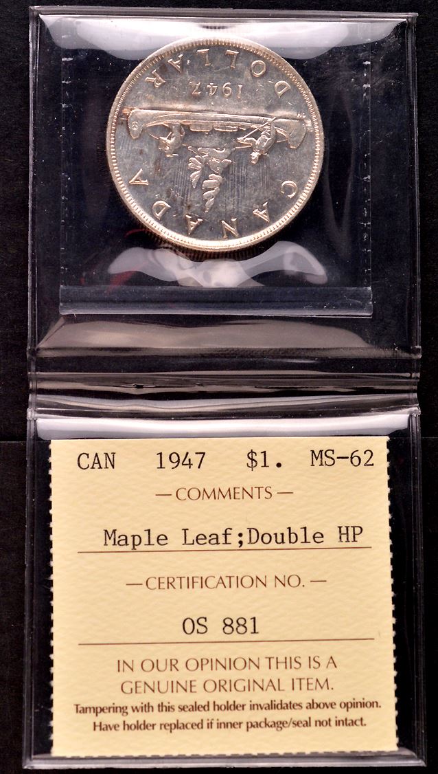 1947, Maple Leaf, Single HP, not attributed on the holder. Graded by ICCS MS-62.