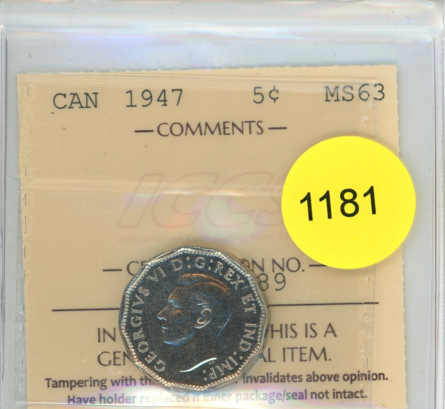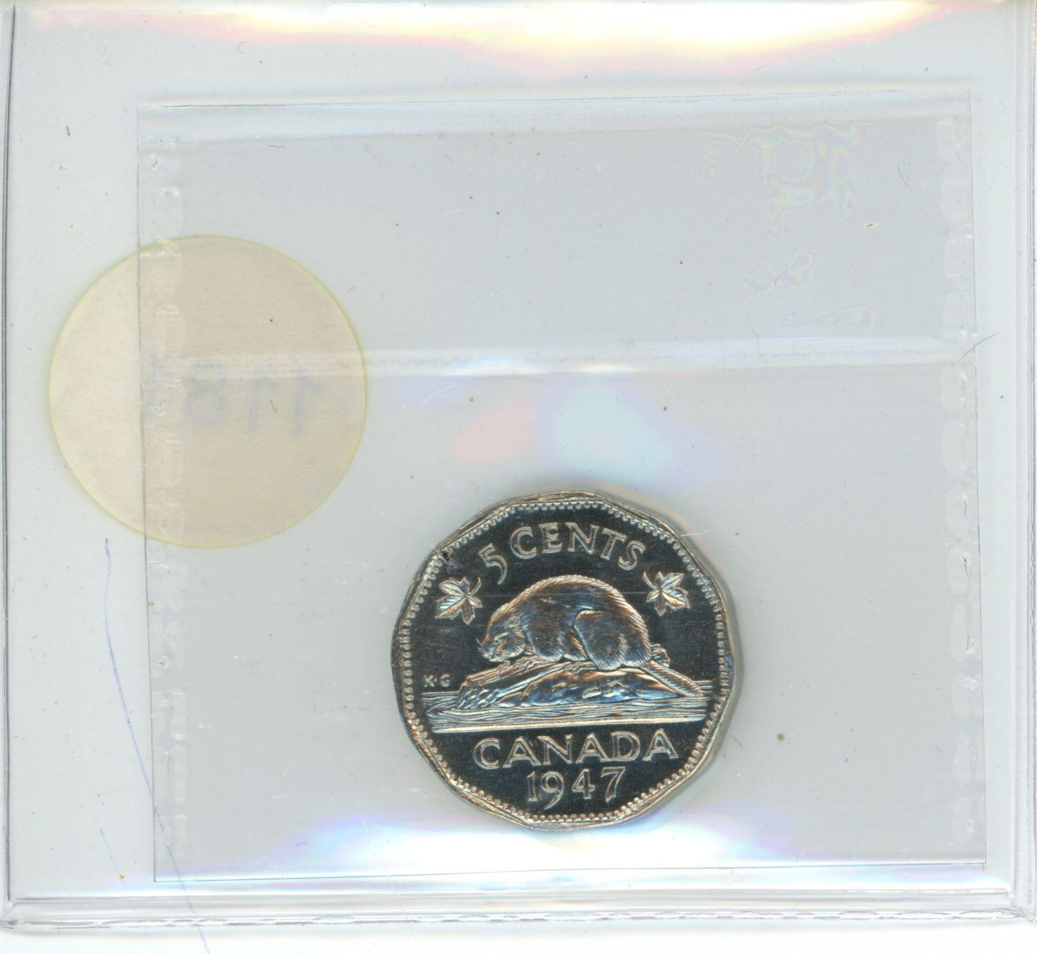 1947 MS63 ICCS Graded Canadian Five Cent Coin