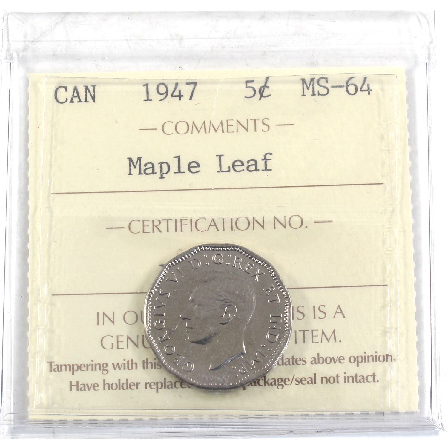 1947 Maple Leaf 5-cent ICCS Certified MS-64