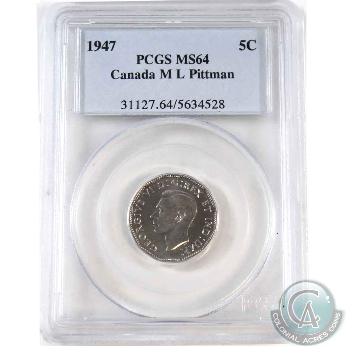 1947 Maple Leaf 5-cent PCGS Certified MS-64; Pittman