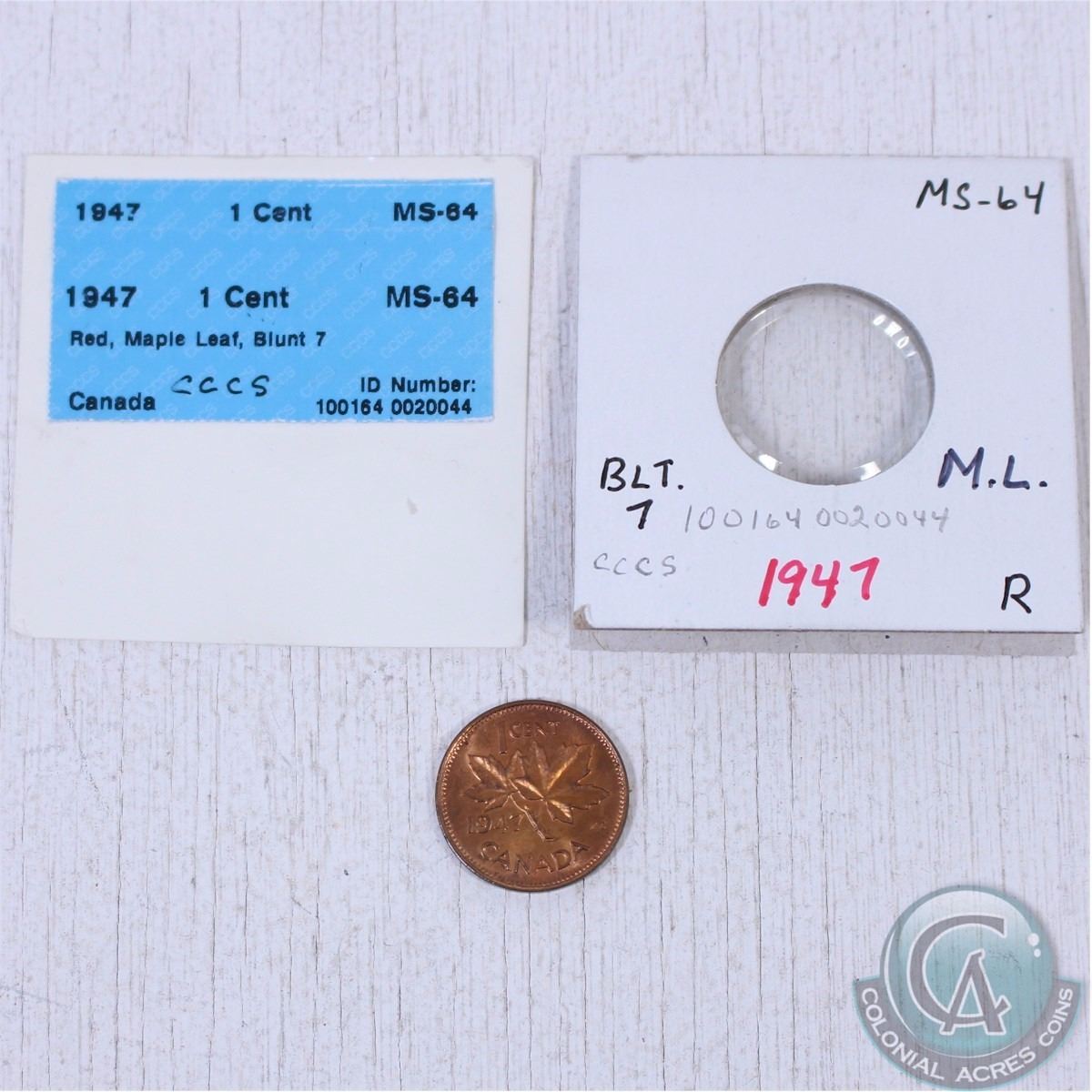 1947 Maple Leaf Blunt 7 Canada 1-cent MS-64 as stated on the holder. This coin was initially certified by CCCS, however the owner has removed the coin from the CCCS Holder.