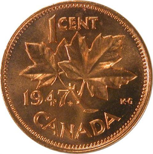 1947 Maple Leaf, Blunt 7 ICCS MS-64 Red. Approaching full red. There is a small planchet lamination on the obverse rim.