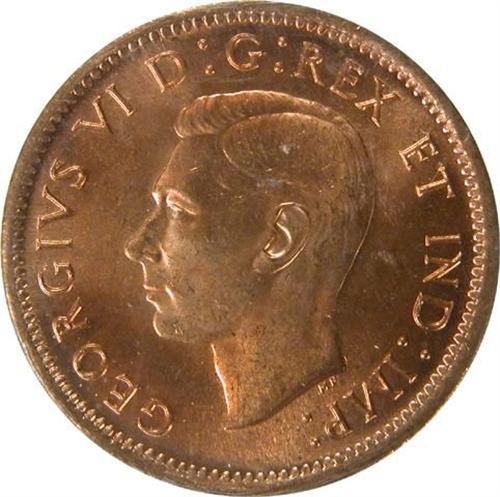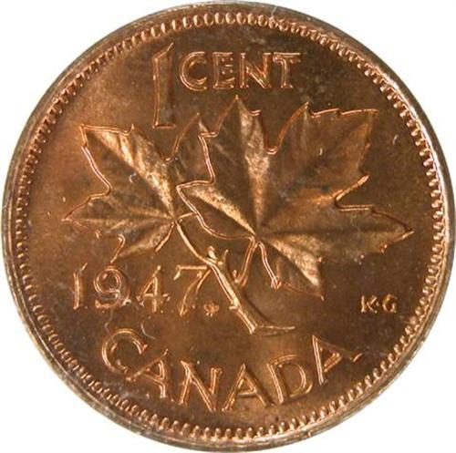 Canada Cent 1947 Maple Leaf Blunt 7 ICCS MS-65 Red. This is a near full red example