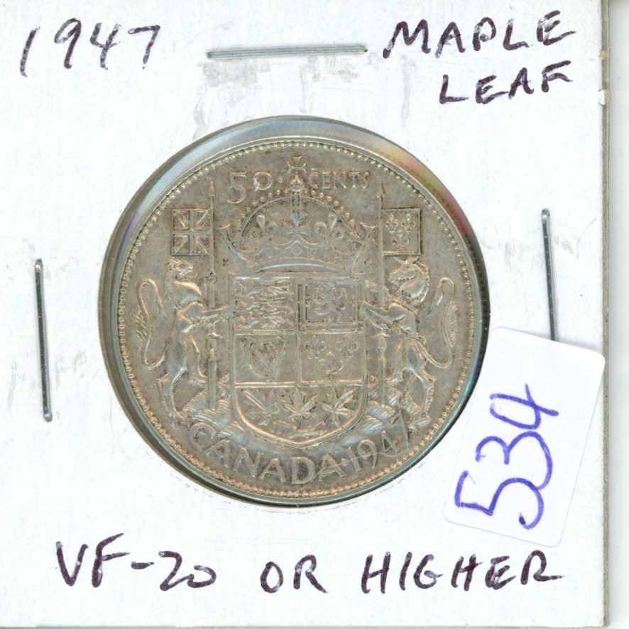 1947 Maple Leaf Canadian Silver 50 Cents. Key Date minted in 1948. VF-20 or higher. Scarce.
