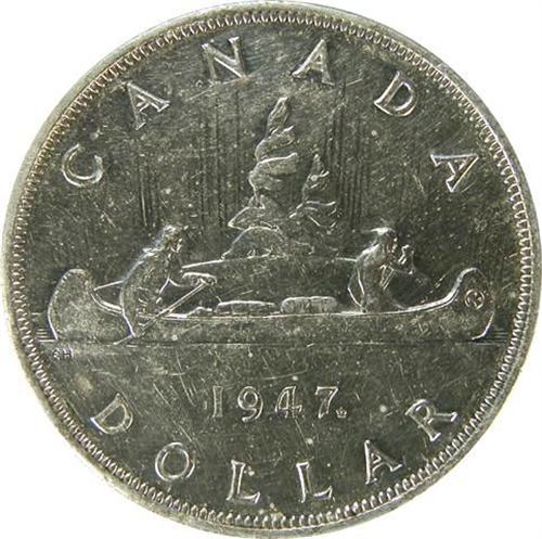 Canada Silver Dollar 1947 Maple Leaf Doubled HP, EF. Untoned