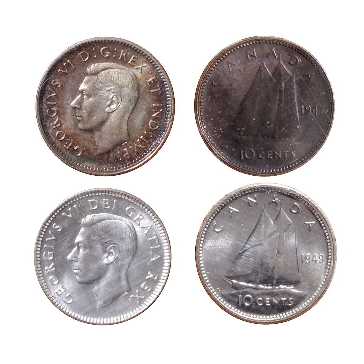 1947. Maple Leaf. ICCS Mint State-65. Designated a 'Cameo'. Light 'P.Q.' golden toning. Ex. Lot #828, C.N.A. auction, July 12-13, 2002; 1949. ICCS Mint State-65. Fully brilliant. Lot #383. C.N.A. auction, July 12-13, 2002. Lot of two (2) coins.
