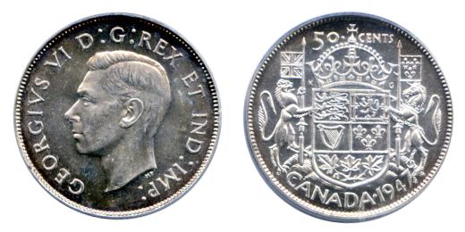 1947. Maple Leaf. Straight 7. PCGS graded Mint State-64. A brilliant coin, with the faintest hints of light blue toning.