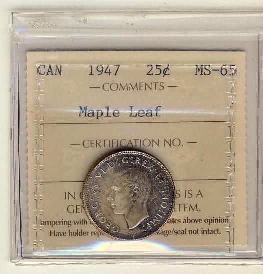 1947 Maple leaf 25¢ ICCS MS65, lovely purple and russet tones over full underlying lustre.