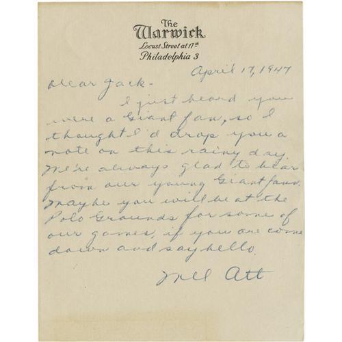 <B>1947 Mel Ott Handwritten Signed Letter.</B></I> The thirty-eight year old slugger would hang up his bat after appearing in just four games this season, turning his attentions entirely toward his New York Giants managerial duties. Showing the good nature that made him as much a fan favorite as his 511 career home runs, Ott makes use of a rain day to pen a note to a young fan: "Dear Jack-- I just heard you were a Giant fan, so I thought I'd drop you a note on this rainy day. We're always glad to hear from our young Giant fans. Maybe you will be at the Polo Grounds for some of our games, if you are come down and say hello. Mel Ott." All ink, including closing signature, is 9/10. Page measures 5x6.5" and exhibits center mailing fold and toning on the lower edge, neither of which are of any concern. <I>LOA from PSA/DNA.</B></I>