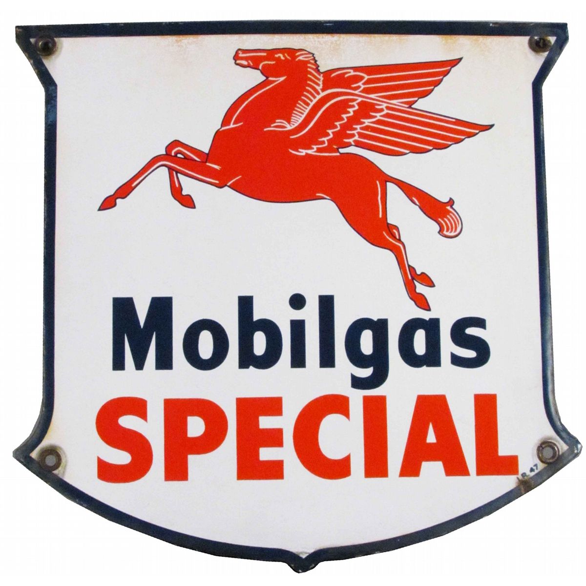1947 Mobilgas Special Die Cut Porcelain Sign. Very minor discoloration mostly at top otherwise very good condition. 12 1/2 X 12 inches.