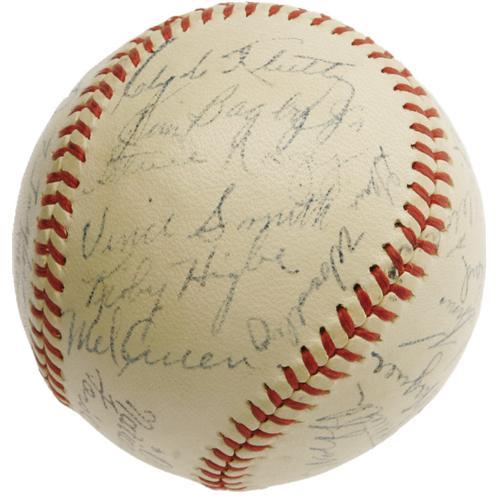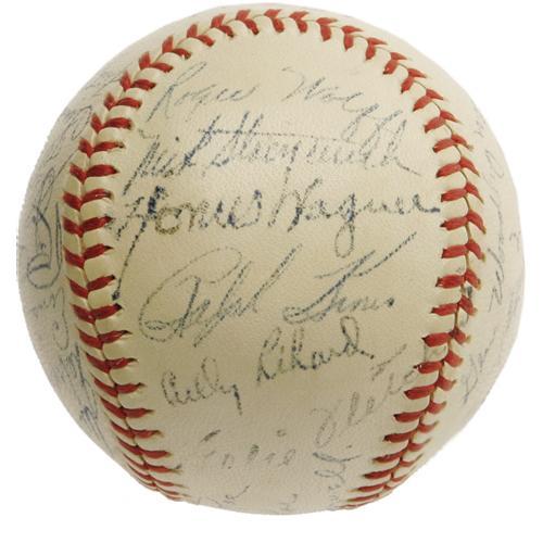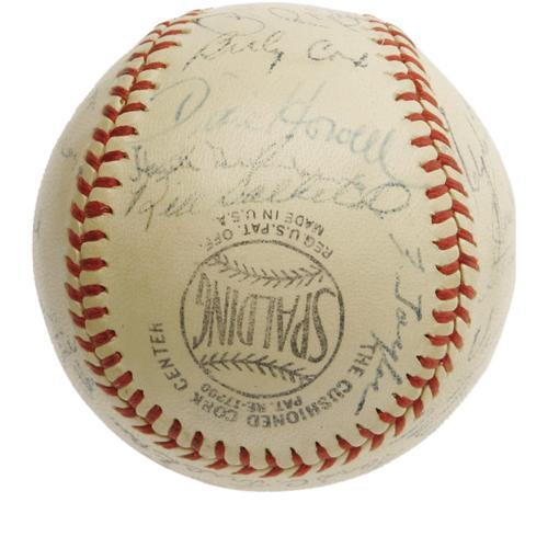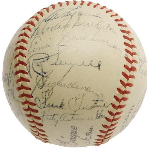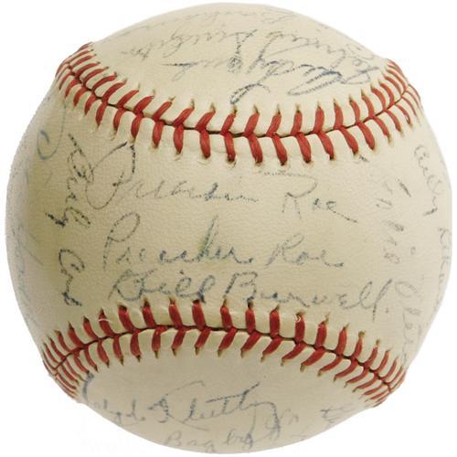 <B>1947 Pittsburgh Pirates Team Signed Baseball with Honus Wagner.</B></I> A full and eminently desirable "Honus Wagner" signature makes this ONL (Frick) ball far more appealing than your typical '47 Pirates model, an historic National League year due to the emergence of a rookie named Robinson in Brooklyn. Joining the Old Dutchman are twenty-seven teammates, including Greenberg, Kiner, Howell, Roe, Higbe and many more. Signature quality ranges from 4/10 to 8/10, with the majority (including the Hall of Famers) at the upper end of that spectrum. <I>LOA from PSA/DNA. From the Personal Collection of Preacher Roe, with his letter of provenance.</B></I> <BR><BR><B>Important notice:</B> Heritage usually auctions material at the rate of 200-250 lots per hour. On some occasions eBay Live bid software or the Internet may not be able to keep up with the pace of the auction. We recommend placing a realistic absentee bid now as insurance to avoid disappointment. Occasionally the auctioneer may eliminate or reject an eBay Live bid, and the auctioneer may also reopen a lot after the close of the eBay live bidding (usually because we missed an audience bid), and may reject your bid even if it shows you as the winning bidder. By bidding via eBay Live, you agree that Heritage may award the lot to another bidder at its sole discretion under the circumstances described above or any other reasonable circumstances. Since eBay bids are not shown to us until we open the lot on the floor, we treat those bids just like floor bids. In most cases the floor responds before the eBay bid is presented to us, due to Internet lag time, so for consistency we have made it a policy that floor bids are always considered first over tie eBay live bids. Also please note that all Heritage lots purchased through eBay Live carry a 22.5% Buyer's Premium. Please make sure you read the Terms and Conditions before you bid. This lot is being auctioned in conjunction with a live floor auction by Heritage Galleries & Auctioneers. All final auction and invoice information will be supplied by Heritage Galleries & Auctioneers, and all other information should be considered preliminary. Lot:19399 <BR><BR><B>Winning Notification and Billing:</B> After the FINAL session in this auction is complete, Heritage will send e-mail and snail mail invoices. This process normally takes several days. All final auction and invoice information will be supplied by Heritage Galleries & Auctioneers, and all other information should be considered preliminary. <BR><BR>This auction will be conducted on a live auction floor and over the Internet through eBay Live. If you choose to place an absentee bid, please take a moment to <font color='#0000ff'><u><a href='http://pages.ebay.com/liveauctions/help/before/laabsentee.html'>learn how eBay Live absentee bidding works</a></u></font><font color='#000000'>