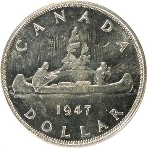 Canada Silver Dollar 1947 Pointed 7 Doubled HP, Doubled 4 ICCS MS-62. Near untoned