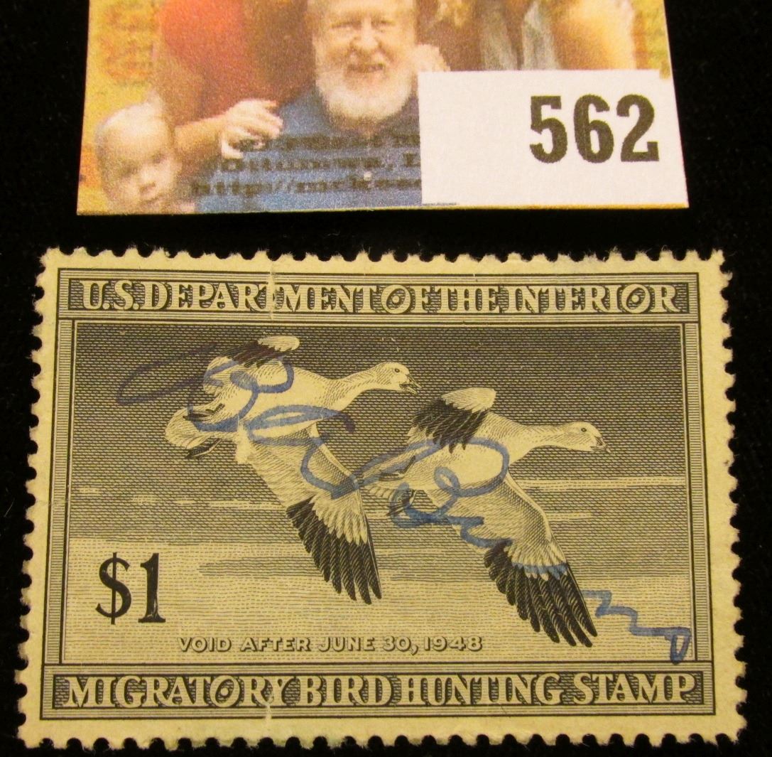 1947 RW14 Federal Migratory Bird Hunting $1 Stamp, signed and obviously used for hunting.