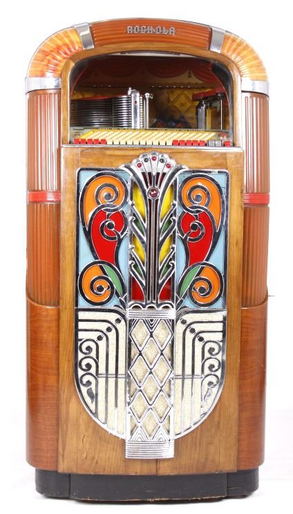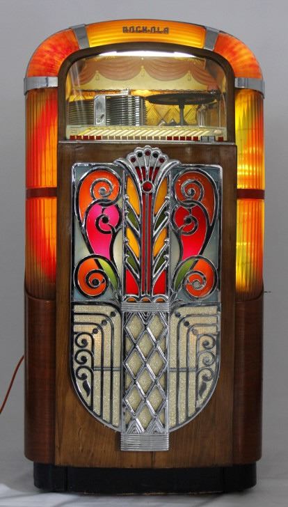 This is a 1947 Rock-Ola Model 1426-RA jukebox. The jukebox features a wooden cabinet with a fantastic chromed front grill. The plastic amber pilasters are lighted and have chrome accents. There are 20 push button selectors with an arched glass window to view the record player that plays 78's. The Rock-Ola jukebox is in very good condition. It is fully functioning and is mechanically sound. The jukebox measures 29.75" W x 28" D x 58.75" T. Serial number is 103498.