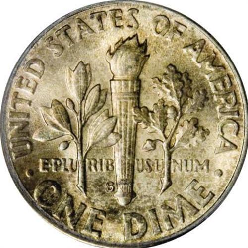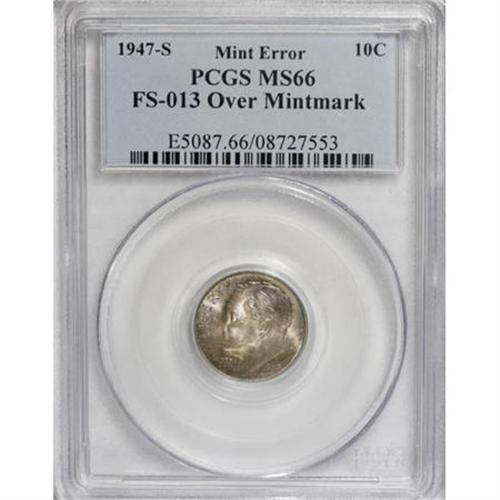 <B>1947-S 10C Over Mintmark MS66 PCGS.</B></I> FS-501, formerly FS-013. Sans Serif S. The <I>Cherrypickers' Guide</B></I> considers this to be an S over D variety, and so does CONECA. Medium golden-tan and aquamarine toning enriches this lustrous and boldly struck Premium Gem.<BR><BR><b>Shipping:</b> Coins & Currency (<a target="_blank" href="http://www.heritageauctions.com/common/shipping.php">view shipping information</a>)