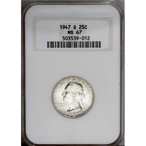 <B>1947-S<25C> MS67 NGC.</B></I> Fully struck with seemingly pristine surfaces and some mottled russet and blue toning near the borders. An eye-appealing and highly lustrous Superb Gem.