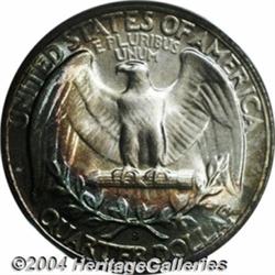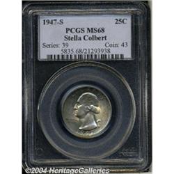 <B>1947-S<25C> MS68 PCGS.</B></I> A spectacularly toned example that has alternating orange, ruby-red, powder-blue, and aqua-marine colors. This lustrous and beautifully preserved Superb Gem is a prize for the toning enthusiast. The 1947-S is a low mintage issue, since only 5,532,000 pieces were produced. Population: 3 in 68, none finer at either service (3/04).<BR><I>From The Del Rio Collection, Part One.</B></I> <BR><BR><B>Important notice:</B> Heritage usually auctions material at the rate of 200-250 lots per hour. On some occasions eBay Live bid software or the Internet may not be able to keep up with the pace of the auction. We recommend placing a realistic absentee bid now as insurance to avoid disappointment. Occasionally the auctioneer may eliminate or reject an eBay Live bid, and the auctioneer may also reopen a lot after the close of the eBay live bidding (usually because we missed an audience bid), and may reject your bid even if it shows you as the winning bidder. By bidding via eBay Live, you agree that Heritage may award the lot to another bidder at its sole discretion under the circumstances described above or any other reasonable circumstances. Since eBay bids are not shown to us until we open the lot on the floor, we treat those bids just like floor bids. In most cases the floor responds before the eBay bid is presented to us, due to Internet lag time, so for consistency we have made it a policy that floor bids are always considered first over tie eBay live bids. Also please note that all Heritage lots purchased through eBay Live carry a 20% Buyer's Premium. Please make sure you read the Terms and Conditions before you bid. </span></font></tr></table></td></tr></table>