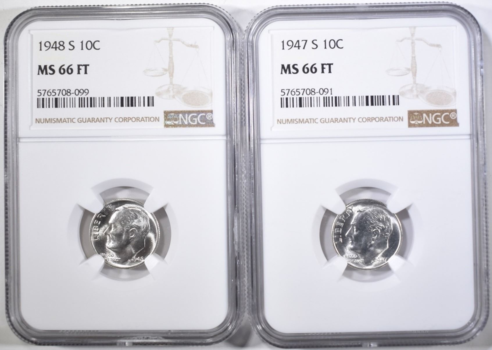 1947-S & 48-S ROOSEVELT DIMES, NGC MS-66 FT