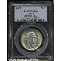 <B>1947-S<50C> Booker T. Washington MS66 PCGS.</B></I> Light apricot patina graces the lightly toned surfaces. Essentially devoid of post-strike impairments, this highly lustrous premium Gem is kept from an even higher grade by a pair of miniscule mint-made planchet flaws below the motto and the faint stria (as produced) on the lower cheek that is always encountered on even the best struck examples of the BTW type. As of (6/04), only a solitary 1947-S Booker T. Washington Half Dollar has been certified finer (as MS67) by PCGS.<BR><I>From the JFS Collection, the #1 All-Time PCGS Registry Set.</B></I> <BR><BR><B>Important notice:</B> Heritage usually auctions material at the rate of 200-250 lots per hour. On some occasions eBay Live bid software or the Internet may not be able to keep up with the pace of the auction. We recommend placing a realistic absentee bid now as insurance to avoid disappointment. Occasionally the auctioneer may eliminate or reject an eBay Live bid, and the auctioneer may also reopen a lot after the close of the eBay live bidding (usually because we missed an audience bid), and may reject your bid even if it shows you as the winning bidder. By bidding via eBay Live, you agree that Heritage may award the lot to another bidder at its sole discretion under the circumstances described above or any other reasonable circumstances. Since eBay bids are not shown to us until we open the lot on the floor, we treat those bids just like floor bids. In most cases the floor responds before the eBay bid is presented to us, due to Internet lag time, so for consistency we have made it a policy that floor bids are always considered first over tie eBay live bids. Also please note that all Heritage lots purchased through eBay Live carry a 20% Buyer's Premium. Please make sure you read the Terms and Conditions before you bid. </span></font></tr></table></td></tr></table>