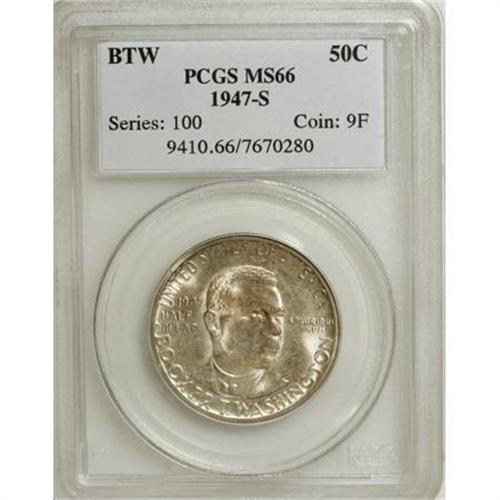 <B>1947-S 50C Booker T. Washington MS66 PCGS.</B></I> PCGS Population (153/6). NGC Census: (173/10). Mintage: 100,000. Numismedia Wsl. Price for NGC/PCGS coin in MS66: $372. (#9410)<BR><BR><b>Shipping:</b> Coins & Currency (<a target="_blank" href="http://www.heritageauctions.com/common/shipping.php">view shipping information</a>)