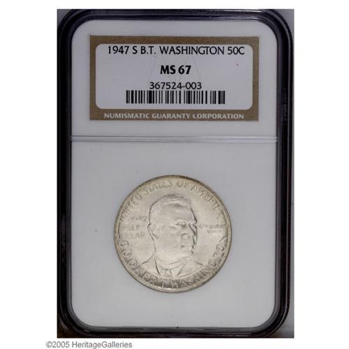 <B>1947-S<50C> Booker T. Washington MS67 NGC.</B></I> An elusive Superb Gem quality example of this scarce issue. It seems that 1946, 1946-S, 1950-S, and 1951 are the only common issues of this commemorative type. All others are scarce or rare, and every issue is rare in Superb Gem quality. Population: 8 in 67, 0 finer (10/05).