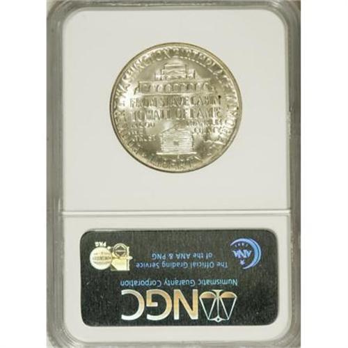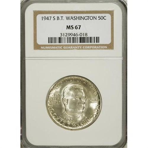 <B>1947-S 50C Booker T. Washington MS67 NGC.</B></I> Light honey-gold patina graces this highly lustrous and undisturbed Superb Gem. A pinpoint golden-brown freckle resides on the N in CABIN. Well struck for the type, which usually comes with prominent planchet abrasions on the lower portion of the cheek. On the present piece, the planchet chatter is barely perceptible. Census: 14 in 67, 0 finer (3/08).<BR><BR><b>Shipping:</b> Coins & Currency (<a target="_blank" href="http://www.heritageauctions.com/common/shipping.php">view shipping information</a>)