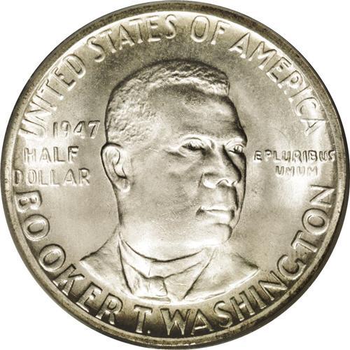 <B>1947-S<50C> Booker T. Washington MS67 PCGS.</B></I> David Bowers, in his <I>Commemorative Coins of the United States,</B></I> estimates that more than 94,000 of the 100,017 1947-S Washington commemoratives (as well as the '47-P and '47-D issues), were melted. PCGS and NGC have certified over 1,300 Mint State 1947-S examples, mostly in near-Gem and Gem condition. Fewer than 15 coins have been graded MS67, and none finer. Traces of olive-tan dot lustrous surfaces, more noticeably so on the reverse, and the design features are well impressed. A few minor marks on Washington's portrait and the reverse Hall of Fame structure are mentioned for accuracy. Population: 4 in 67, 0 finer (4/06).