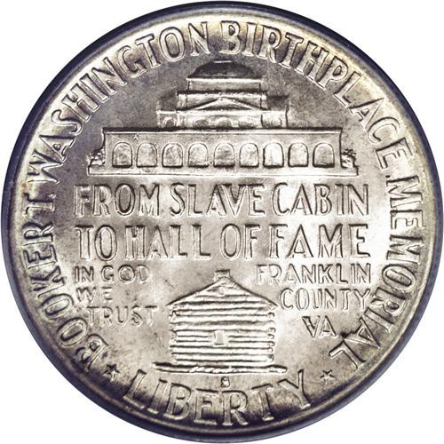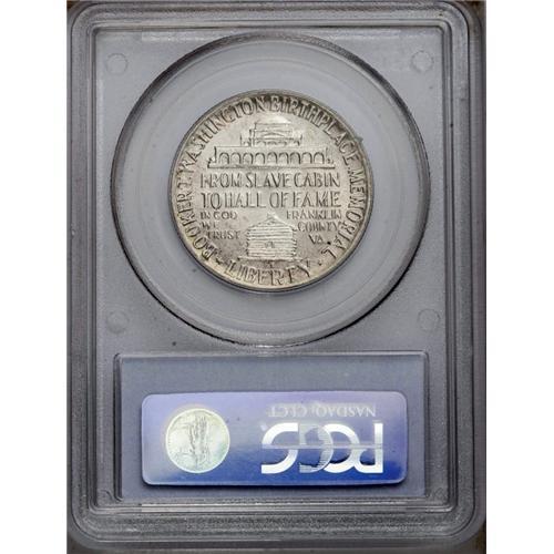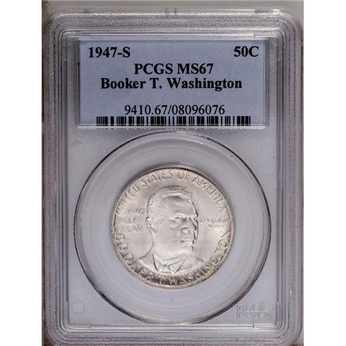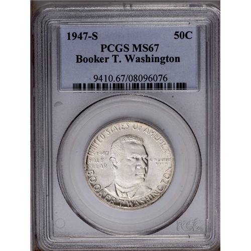 <B>1947-S<50C> Booker T. Washington MS67 PCGS.</B></I> David Bowers, in his <I>Commemorative Coins of the United States,</B></I> estimates that more than 94,000 of the 100,017 1947-S Washington commemorative (as well as the '47-P and '47-D issues), were melted. NGC and PCGS have certified about 1,400 Mint State 1947-S examples, mostly in near-Gem and Gem condition. Fewer than 15 coins have been graded MS67, by the two services, and none have been certified finer. Traces of olive-tan dot lustrous surfaces, more noticeably so on the reverse, and the design features are well impressed. A few minor marks on Washington's portrait and the reverse Hall of Fame structure are mentioned for accuracy. Population: 4 in 67, 0 finer (9/06).