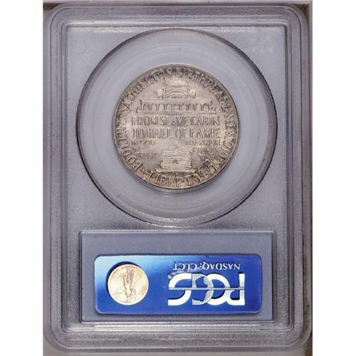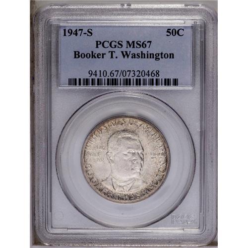 <B>1947-S<50C> Booker T. Washington MS67 PCGS.</B></I> Superb brilliant luster is overlaid with some mottled reddish-golden and olive-russet toning, particularly at the obverse border. The strike is sharp and without question and only a couple of microscopic contact marks are detected on the obverse under close examination. This coin sits solely on top of the pile of all '47-S Booker T. Washingtons PCGS has certified to date. Population: 2 in 67, none are finer at either service (3/06). <BR><BR><B>Important notice:</B> Heritage usually auctions material at the rate of 200-250 lots per hour. On some occasions eBay Live bid software or the Internet may not be able to keep up with the pace of the auction. We recommend placing a realistic absentee bid now as insurance to avoid disappointment. Occasionally the auctioneer may eliminate or reject an eBay Live bid, and the auctioneer may also reopen a lot after the close of the eBay live bidding (usually because we missed an audience bid), and may reject your bid even if it shows you as the winning bidder. By bidding via eBay Live, you agree that Heritage may award the lot to another bidder at its sole discretion under the circumstances described above or any other reasonable circumstances. Since eBay bids are not shown to us until we open the lot on the floor, we treat those bids just like floor bids. In most cases the floor responds before the eBay bid is presented to us, due to Internet lag time, so for consistency we have made it a policy that floor bids are always considered first over tie eBay live bids. Also please note that all Heritage lots purchased through eBay Live carry a 20% Buyer's Premium. Please make sure you read the Terms and Conditions before you bid. This lot is being auctioned in conjunction with a live floor auction by Heritage Galleries & Auctioneers. All final auction and invoice information will be supplied by Heritage Galleries & Auctioneers, and all other information should be considered preliminary. Lot:5119 <BR><BR><B>Winning Notification and Billing:</B> After the FINAL session in this auction is complete, Heritage will send e-mail and snail mail invoices. This process normally takes several days. All final auction and invoice information will be supplied by Heritage Galleries & Auctioneers, and all other information should be considered preliminary. <BR><BR>This auction will be conducted on a live auction floor and over the Internet through eBay Live. If you choose to place an absentee bid, please take a moment to <font color='#0000ff'><u><a href='http://pages.ebay.com/liveauctions/help/before/laabsentee.html'>learn how eBay Live absentee bidding works</a></u></font><font color='#000000'>
