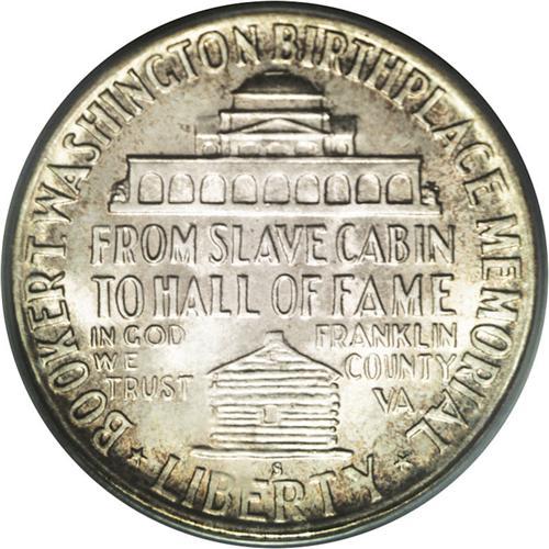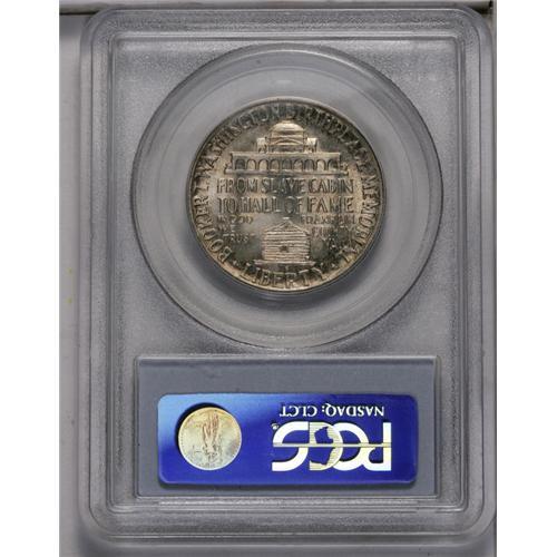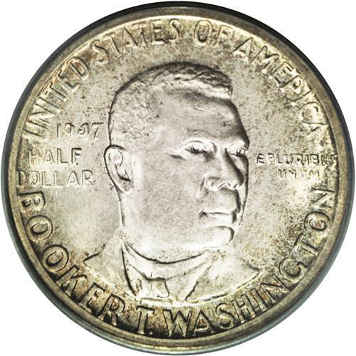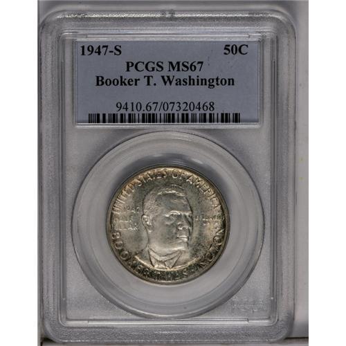 <B>1947-S<50C> Booker T. Washington MS67 PCGS.</B></I> Superb brilliant luster is overlaid with some mottled reddish-golden and olive-russet toning, particularly at the obverse border. The strike is sharp and without question and only a couple of microscopic contact marks are detected on the obverse under close examination. This coin sits solely on top of the pile of all '47-S Booker T. Washingtons PCGS has certified to date. Population: 4 in 67, 0 finer (5/06).