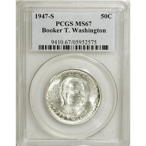 <B>1947-S 50C Booker T. Washington MS67 PCGS.</B></I> The completely untoned surfaces are silver-white, with extraordinary reflectivity and flash. The 1947-PDS set was the last time that mintages exceeded 100,000 pieces until 1950. One of six so graded at PCGS, with none finer at either service (4/07).<BR><BR><b>Shipping:</b> Coins & Currency (<a target="_blank" href="http://www.heritageauctions.com/common/shipping.php">view shipping information</a>)