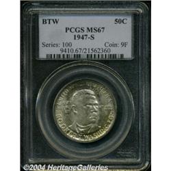 <B>1947-S<50C> Booker T. Washington MS67 PCGS.</B></I> Superb brilliant luster is overlaid with some mottled reddish-golden toning, particularly on the obverse. The strike is sharp and without question and only a couple of microscopic contact marks are detected on the obverse under close examination. This coin sits solely on top of the pile of all '47-S Booker T. Washingtons PCGS has certified to date. <BR><BR><B>Important notice:</B> Heritage usually auctions material at the rate of 200-250 lots per hour. On some occasions eBay Live bid software or the Internet may not be able to keep up with the pace of the auction. We recommend placing a realistic absentee bid now as insurance to avoid disappointment. Occasionally the auctioneer may eliminate or reject an eBay Live bid, and the auctioneer may also reopen a lot after the close of the eBay live bidding (usually because we missed an audience bid), and may reject your bid even if it shows you as the winning bidder. By bidding via eBay Live, you agree that Heritage may award the lot to another bidder at its sole discretion under the circumstances described above or any other reasonable circumstances. Since eBay bids are not shown to us until we open the lot on the floor, we treat those bids just like floor bids. In most cases the floor responds before the eBay bid is presented to us, due to Internet lag time, so for consistency we have made it a policy that floor bids are always considered first over tie eBay live bids. Also please note that all Heritage lots purchased through eBay Live carry a 20% Buyer's Premium. Please make sure you read the Terms and Conditions before you bid. </span></font></tr></table></td></tr></table>