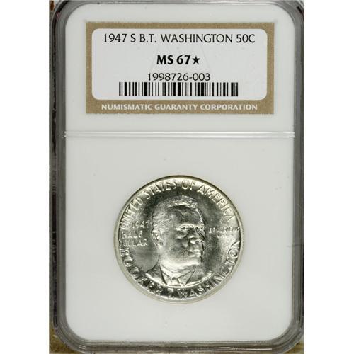 <B>1947-S 50C Booker T. Washington MS67 <img border='0' src='http://www.heritagecoins.com/images/star.gif' width=10 height=10> NGC.</B></I> This is a nearly unbelievable example of the issue with bright silver surfaces and reflective fields. In fact, it is our opinion that this piece should have received a PL designation from the grading service. Census: 3 in 67 S, 0 finer (1/07).<BR><BR><b>Shipping:</b> Coins & Currency (<a target="_blank" href="http://www.heritageauctions.com/common/shipping.php">view shipping information</a>)