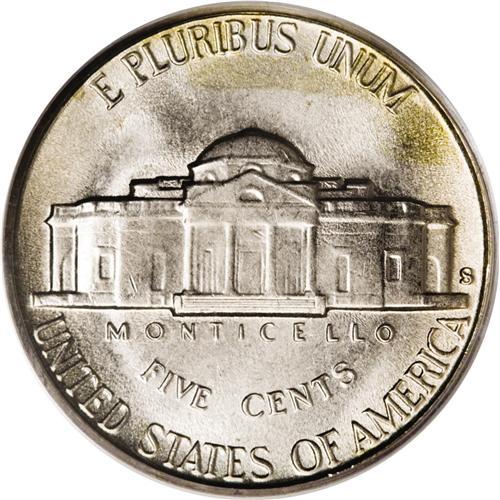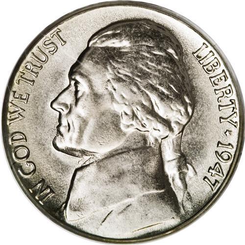 <B>1947-S 5C MS66 Full Steps PCGS.</B></I> Boldly struck save for minor weakness on some parts of Monticello, with a curious patch of orange-peel granularity (as struck) noted between Jefferson's jaw and collar. Bright, lustrous, and carefully preserved. Very scarce with Full Steps. Population: 43 in 66 Full Steps, 1 finer (10/06).<BR><BR><b>Shipping:</b> Coin/Currency (<a target="_blank" href="http://www.heritageauctions.com/common/shipping.php">view shipping information</a>)