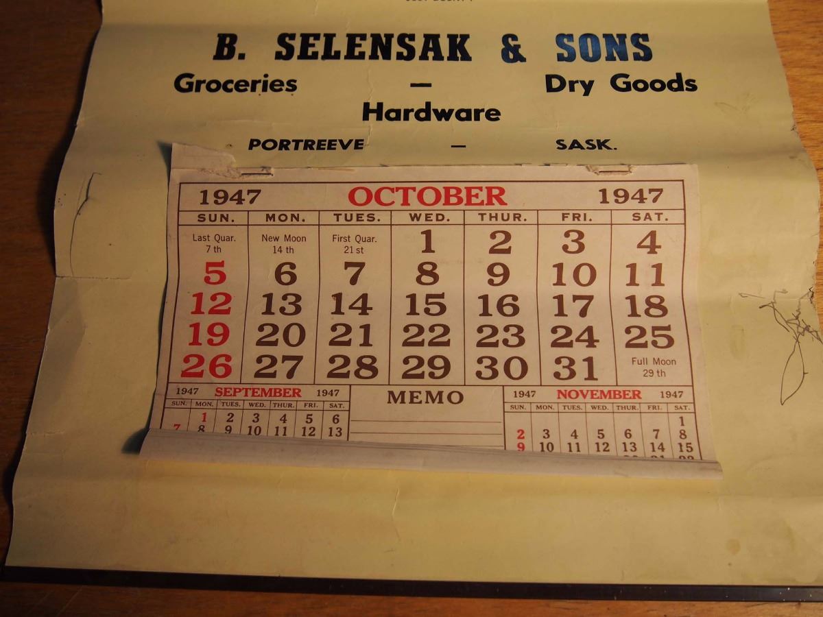 1947 Selensak And Sons Calendar, Portreeve Sask