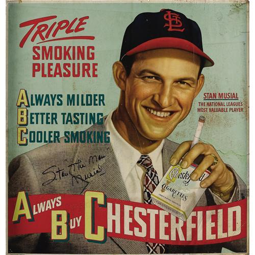 <B>1947 Stan Musial Chesterfield Cigarettes Advertising Sign, Signed.</B></I> Though "The Man" took home the National League Most Valuable Player Trophy on three separate occasions, this colorful sign recalling the days when tobacco and baseball walked hand in hand is generally attributed to the year following Musial's 1946 honor. Regardless of one's personal convictions about the product Musial is touting, no collector of vintage advertising signs could fail to be impressed by this heavy cardboard 20.5x21.5" relic from a drugstore window. A degree of wear, visible in the form of scattered wrinkling and light staining, does little to detract from the marvelous aesthetics, and a 10/10 black sharpie autograph reading "Stan 'The Man' Musial" only heightens its charm. The sign is gorgeously presented within a 29x29" shadowbox, ready for your trophy room wall. <I>LOA from PSA/DNA. LOA from James Spence Authentication.</B></I><BR><BR><b>Shipping:</b> Framed - with Glass, Large (<a target="_blank" href="http://www.heritageauctions.com/common/shipping.php">view shipping information</a>)