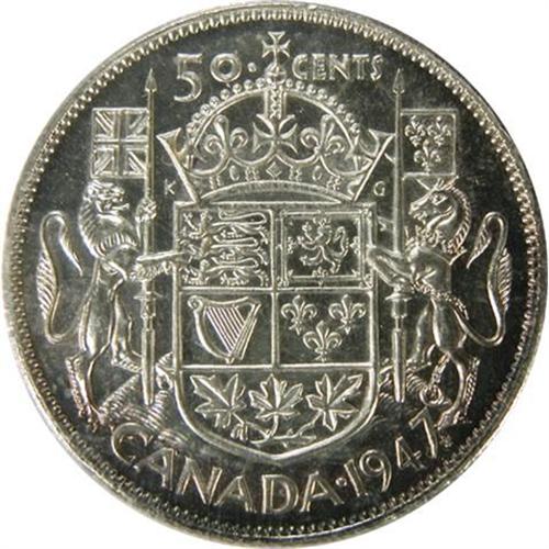 Canada Fifty Cents 1947 Straight 7 Maple Leaf ICCS MS-62. Light amber rim toning