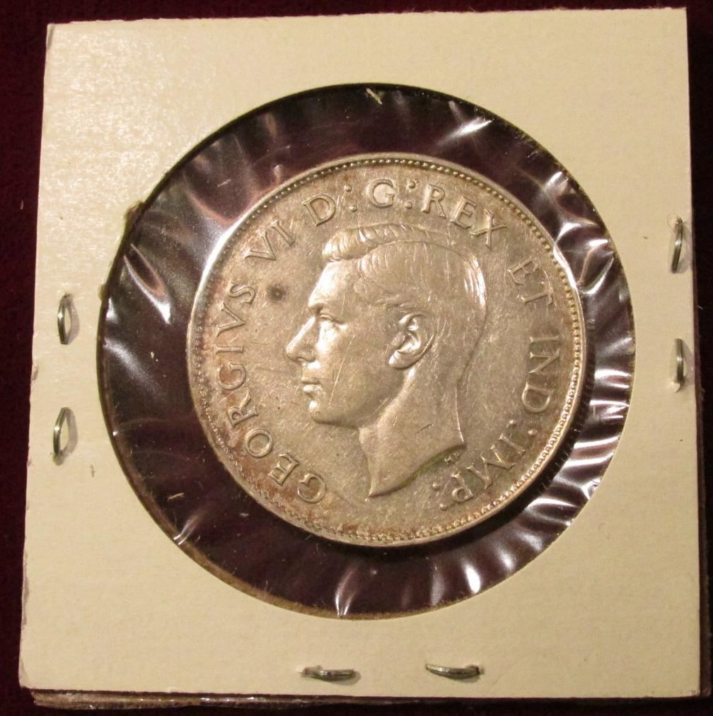 1947 Straight 7, Wide date Canada Silver Half Dollar. AU. Catalog value $65.00.