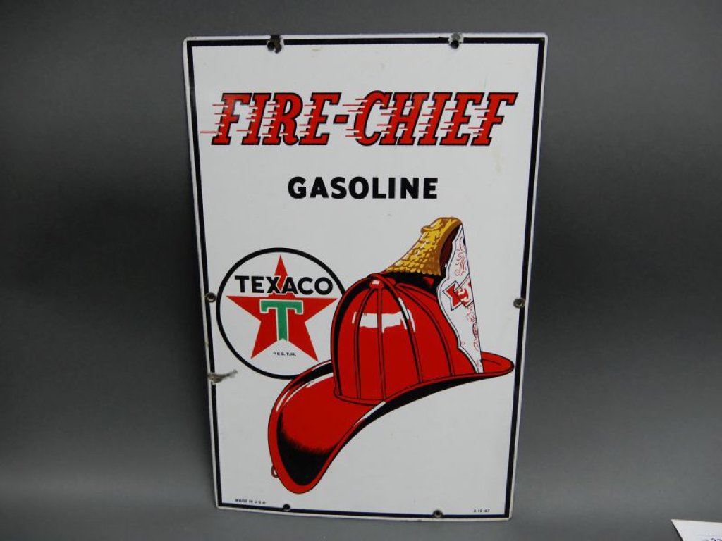 1947 TEXACO FIRE-CHIEF GASOLINE PORC PUMP PLATE 18" X 12"- PORC. LOSS AT HANGER HOLE & LEFT SIDE- U.S.A LOCATION: LOWER RIGHT
