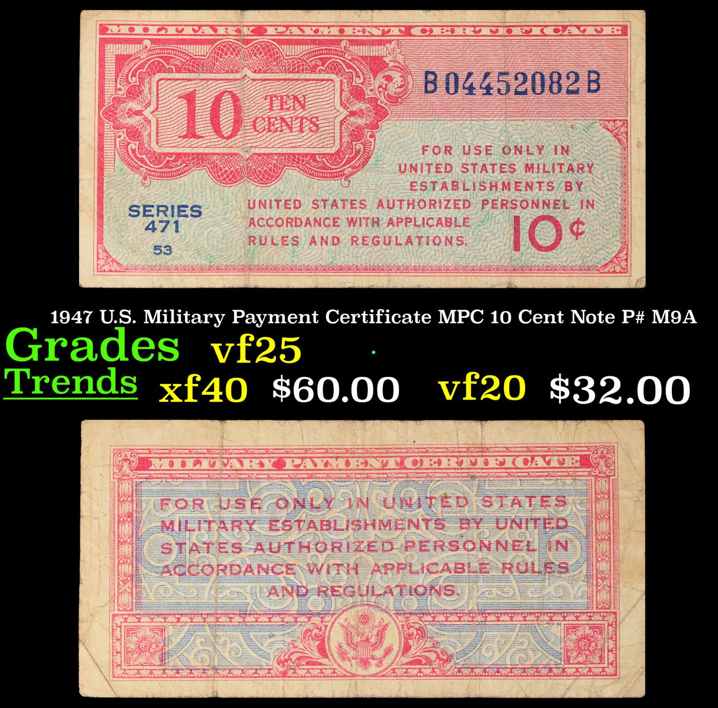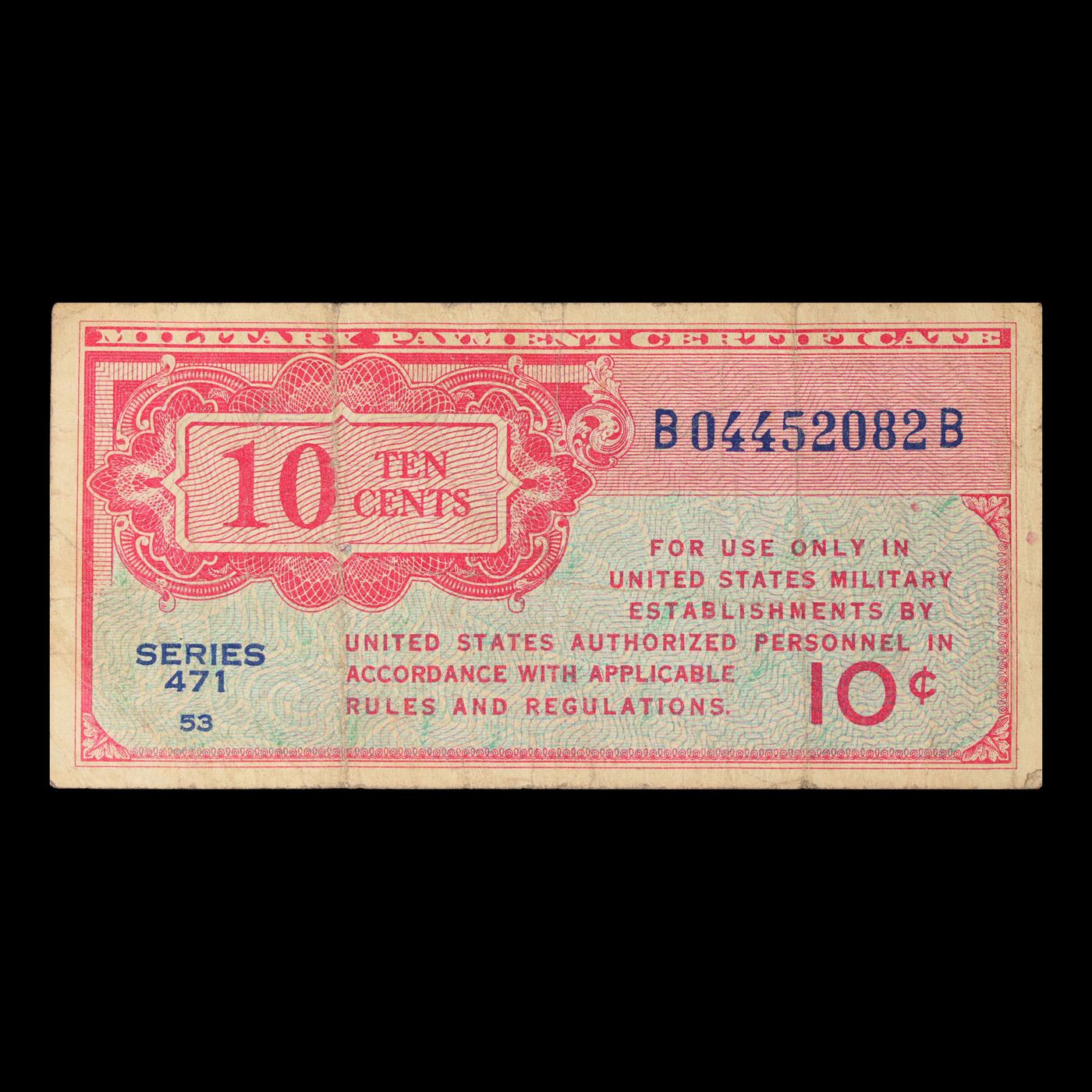 1947 U.S. Military Payment Certificate MPC 10 Cent Note P# M9A Grades vf+. Allied Military Currency ("AMC") was a form of currency issued by the Allied powers during World War II, to be issued to troops entering liberated or newly occupied countries. Historically, soldiers serving overseas had been paid in local currency rather than in their "home" currency. Most cash drawn by soldiers would go directly into the local economy, and in a damaged economy the effects of a hard currency such as the dollar circulating freely alongside weaker local currencies could be severely problematic, risking severe inflation.