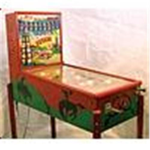 This vintage coin operated pinball game was manufactured by United in 1947 and is entitled "Nevada." Wild West theme is accentuated by a flashy 1940s convertible rolling through the backglass artwork. Fully restored and repainted to NRMT condition, retrofitted with a flipper kit and flippers had not yet been introduced at the time of release. Perfect working condition. This item will be expensive to ship.