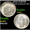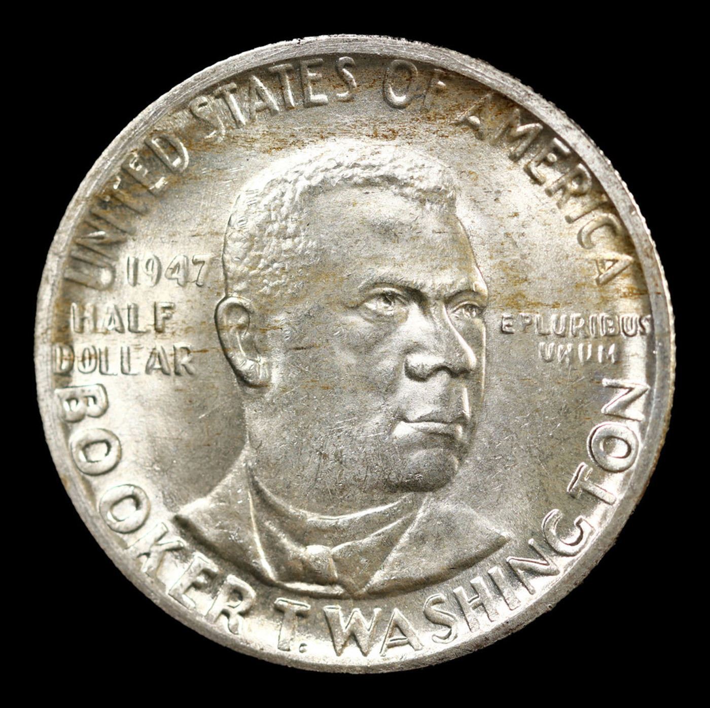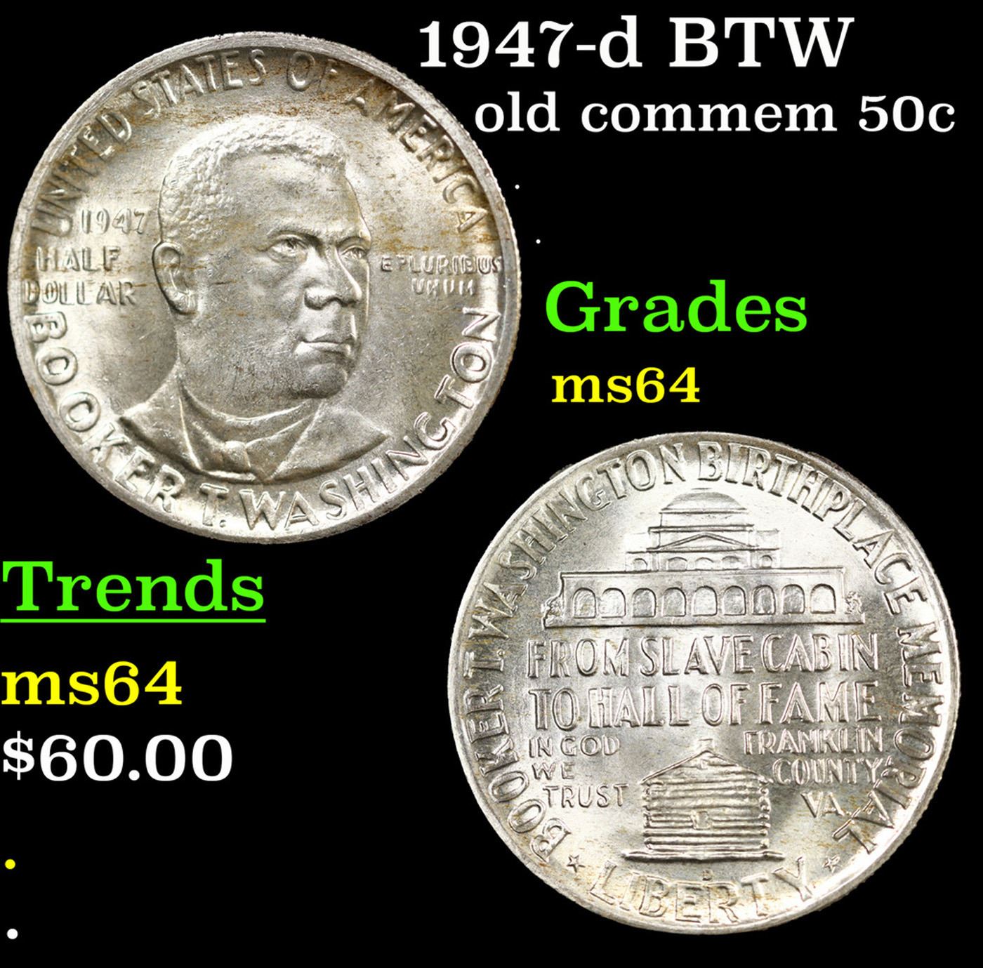 1947-d BTW Old Commem Half Dollar 50c Grades Choice Unc. When examining a Booker T. Washington commemorative look for wear on the high points, on the obverse that is Mr. Washington's right Cheek (from his perspective), and on the reverse the arches on the top building.