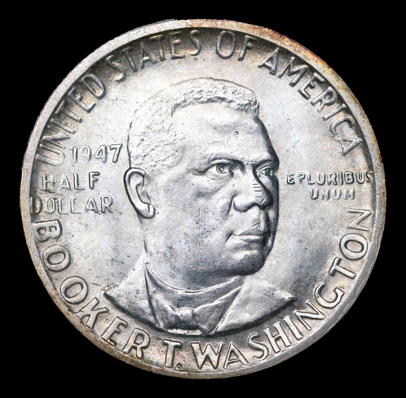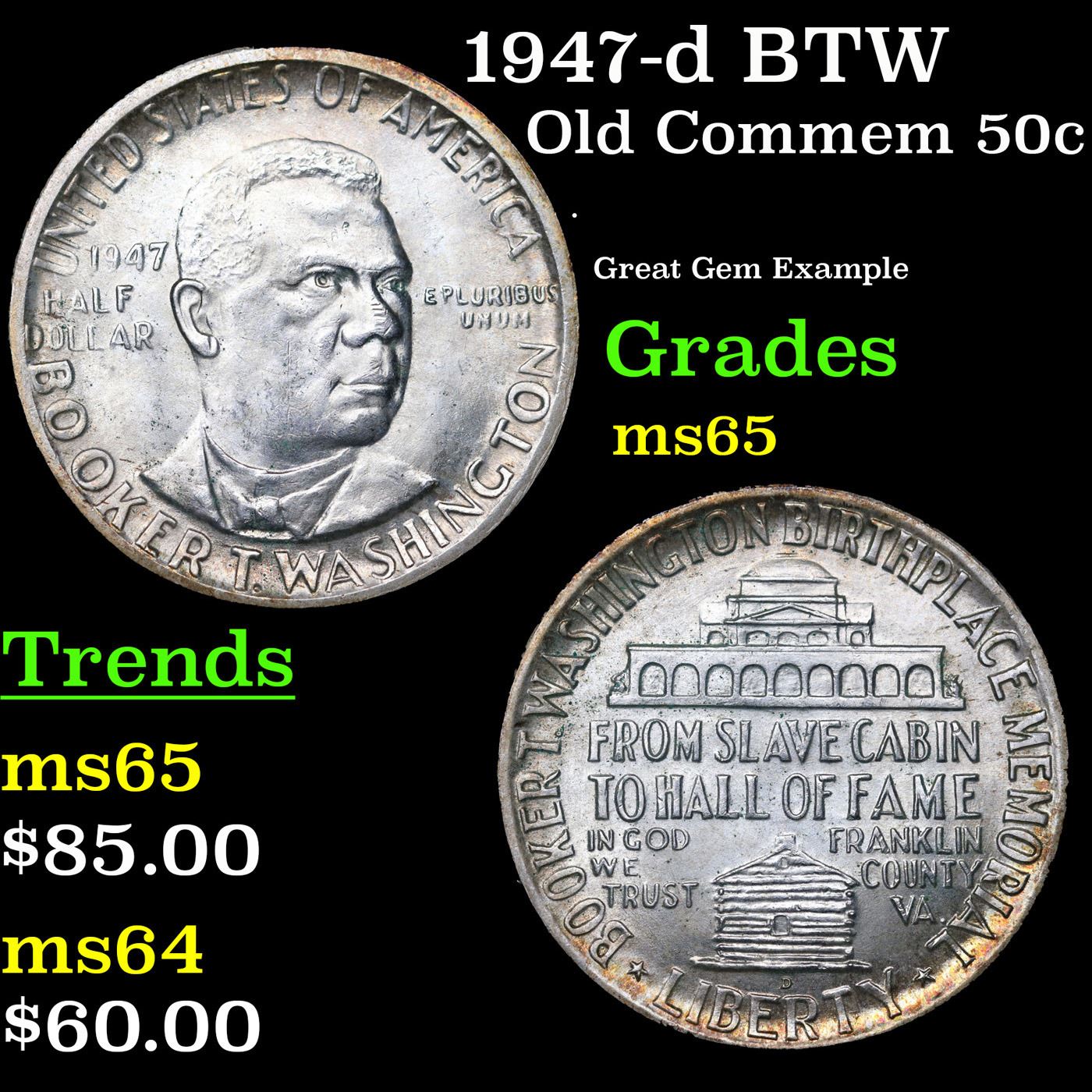 1947-d BTW Old Commem Half Dollar 50c Grades GEM Unc. When examining a Booker T. Washington commemorative look for wear on the high points, on the obverse that is Mr. Washington's right Cheek (from his perspective), and on the reverse the arches on the top building.