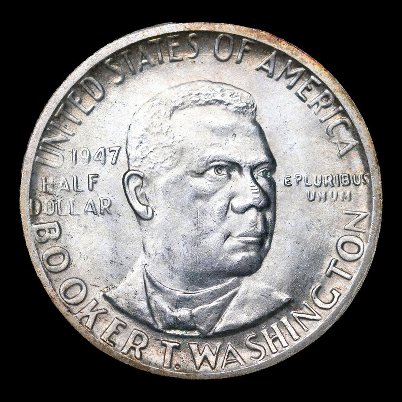 1947-d BTW Old Commem Half Dollar 50c Grades GEM Unc. When examining a Booker T. Washington commemorative look for wear on the high points, on the obverse that is Mr. Washington's right Cheek (from his perspective), and on the reverse the arches on the top building.