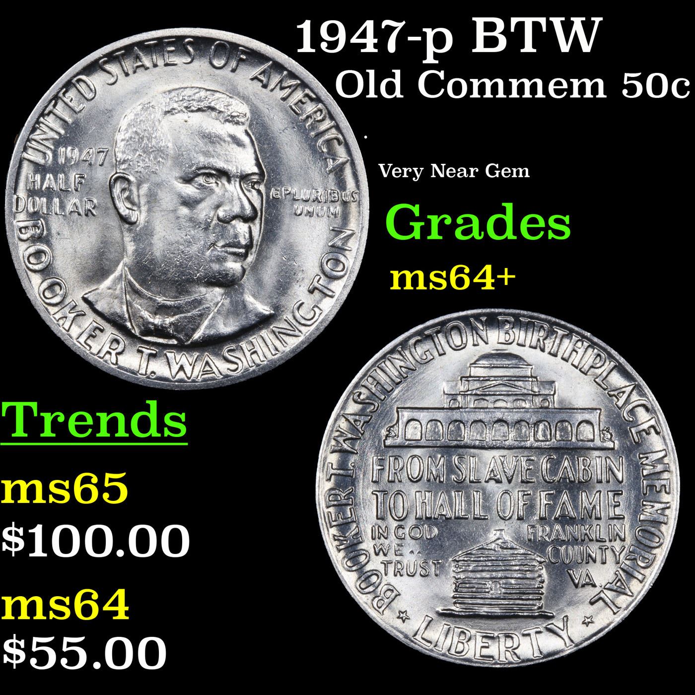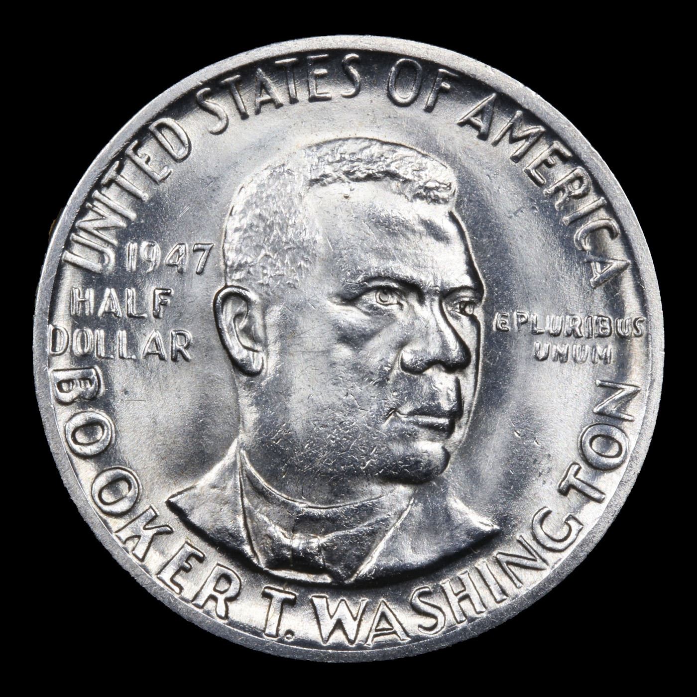 1947-p BTW Old Commem Half Dollar 50c Grades Choice+ Unc. When examining a Booker T. Washington commemorative look for wear on the high points, on the obverse that is Mr. Washington's right Cheek (from his perspective), and on the reverse the arches on the top building.
